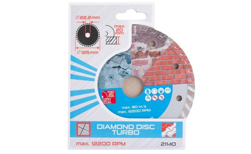Opis:Dijamantna ploča DIAMANT, izvedba: turbo, visokokvalitetni dijamantni sloj s visokim udjelom dijamantne prašine, precizna obrada, otporna na visoke temperature, upotreba: za suho i mokro rezanje betona, armiranog betona, opeke, kamena... pakiranje: kartonski blister, uključen redukcijski prsten s 22,2 na 20 mm, dimenzije: navedene u nazivu proizvoda