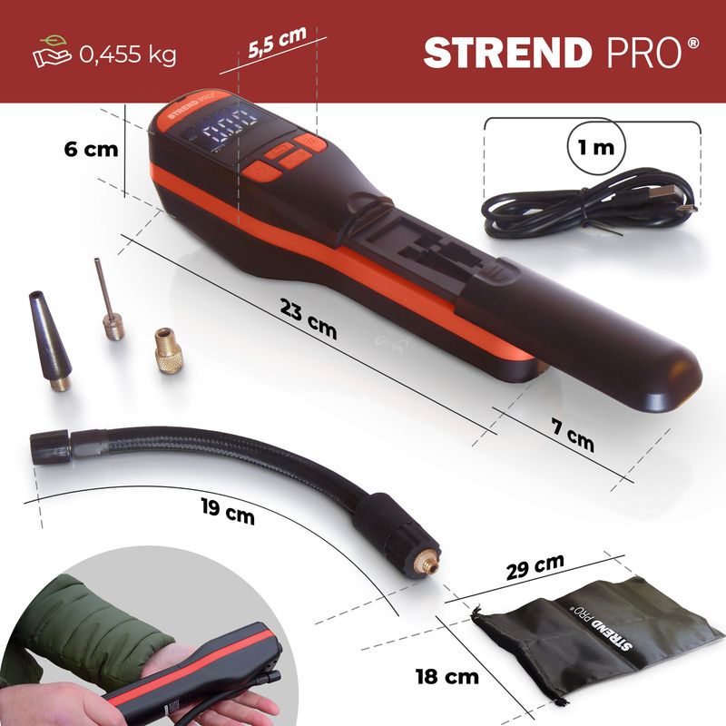 | Opis: | Strend Pro bežični ručni kompresor zraka namijenjen je za napuhavanje guma automobila, bicikala i motocikala, kao i malih napuhanih igračaka, sportskih predmeta i predmeta za plažu. Kompresor je opremljen USB-C priključkom za punjenje, LED svjetlom s funkcijom SOS treptanja i digitalnim zaslonom. Ima 4 različita načina napuhavanja, s unaprijed postavljenim vrijednostima tlaka zraka koje se mogu lako podesiti. Senzor tlaka zraka automatski isključuje napuhavanje kada se dostigne ciljana vrijednost. Vrijeme rada: cca. 25 minuta. Vrijeme punjenja: 4-5 sati. Duljina crijeva je 18 cm. |